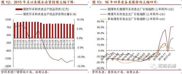 工程机械间接受益上游行业煤矿、铁矿石、有色金属等供给侧改革,2016年煤矿、铁矿石、有色金属等原材料价格大涨,企业盈利明显改善。而2016年煤矿、铁矿石、有色金属三个行业的固定资产投资增速-24%、-10%、-28%,自2013年以来持续低迷,与商品价格趋势已完全背离,我们认为这是暂时的,商品价格的上涨势必带来上游企业盈利的好转,2017年将加大资本开支,增加或更新设备,今年中、大挖销售好于小挖主要也是受益于上游矿山行业盈利改善。所以我们判断,如果供给侧改革的国家战略不变,矿山相关投资对工程机械等相关设备(挖掘机、装载机、煤机)的需求拉动将在明年开始逐步体现。