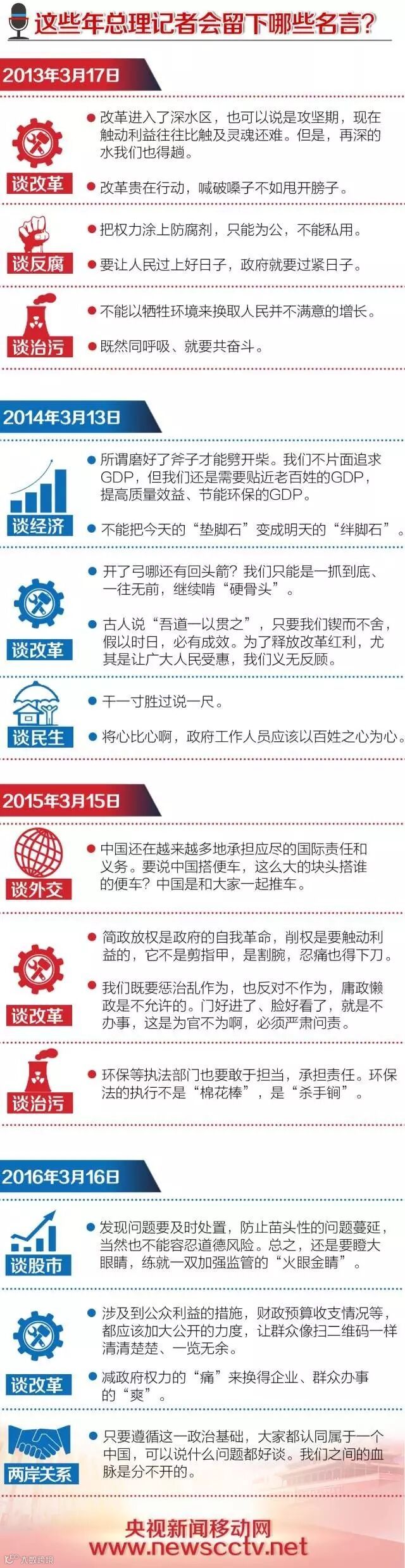 总理记者会的结束也标志着2017年两会的闭幕。在听完了李克强总理今天答记者问之后,让我们来回顾一下这些年总理记者会留下的名言。