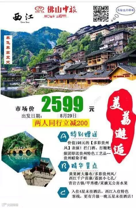2、特别安排西江观看苗族风情表演,品苗家特色酸汤鱼,赏苗家歌舞表演,体验苗家民俗。3、精选经典:黄果树,西江千户苗寨,荔波小七孔。一次走完贵州最美景点。还赠游青岩古镇及采摘无公害水果!