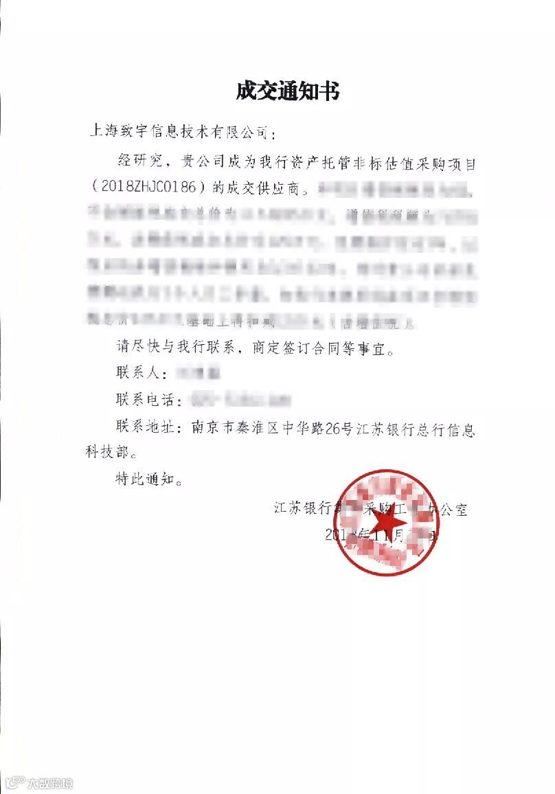 11月19日,上海致宇与江苏银行就资产托管非标估值采购项目达成合作。