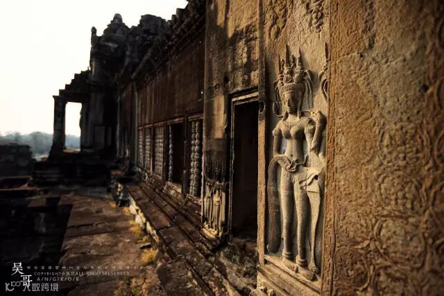 吴哥所有建筑随处可见的女神Apsara。整个吴哥寺有3000多个Apsara。传说当年搅拌乳海创世时,天神与阿修罗合力搅拌的乳海卷起朵朵浪花,每一朵浪花化身成一个Apsara女神飞天而出。