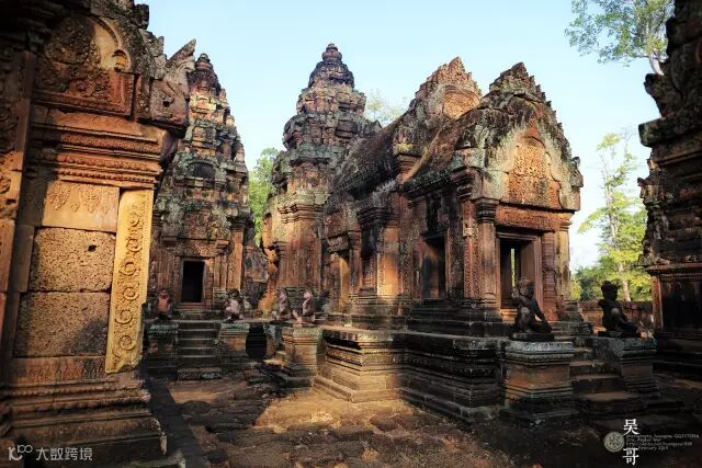 女王宫(Banteay Srei),据说是国王为某个隐退国师修建的私人寺庙,叫女王宫并不准确。这里以无以伦比精美绝伦鬼斧神工的红色砂岩石雕著称。就精美程度我认为在整个东南亚古建筑中也是首屈一指的。吴哥古迹经历了红砖、红色砂岩石和青灰砂岩石的变化。红色砂岩石质地较软,不适合修建大型建筑,适合画面复杂、精美细腻的小型雕刻。女王宫就是其中的典型代表。早期建筑尤其注意门楣的雕刻装饰。在游览外圈早期寺庙的时候,需要留意各种门楣上的雕刻。