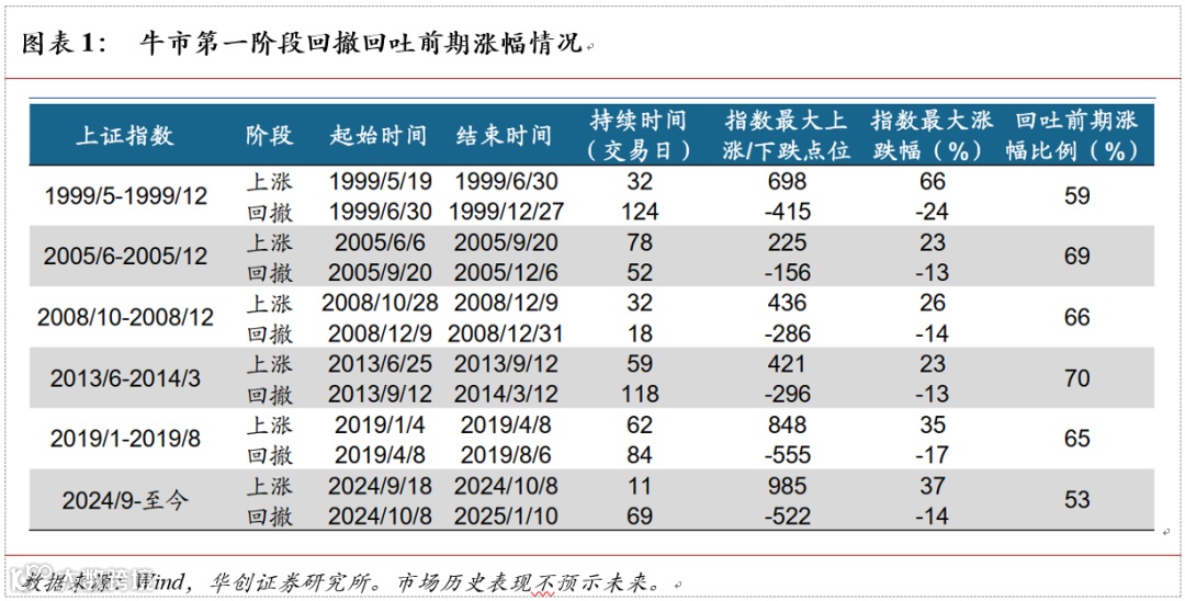 参考历史牛市第一阶段,市场量价或均已接近回撤下沿。牛市中的上涨往往是一波三折的过程,我们认为当前市场对于后续政策的进一步落地以及经济复苏仍处于观测期,风险偏好的回落带来近期市场持续缩量下跌。从价格来看,参考历史上五轮牛市第一阶段的回撤经验,上证指数在上涨过后平均回吐前期涨幅的 66%。24/9/18 以来,上证指数从底部 2689 点上行 985 点至24/10/8 的 3674 点后,截至 1/10 收盘已累计下跌 13%,回吐前期涨幅的 51%(最大回吐幅度 53%)。