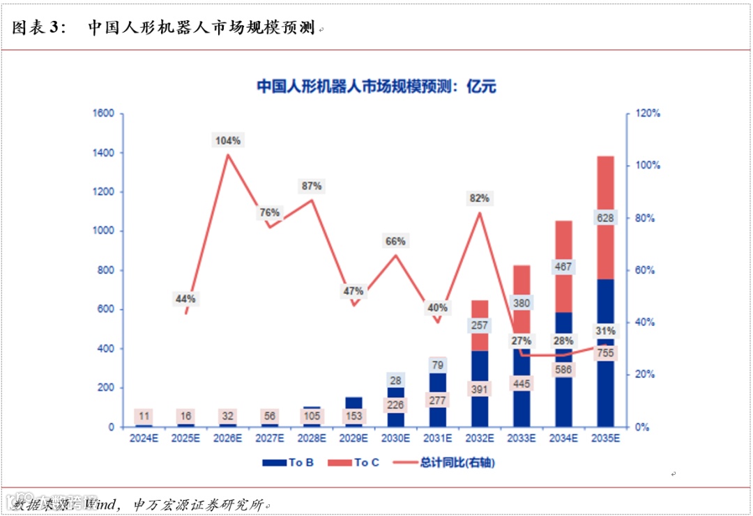 其次,科技产业中AI应用和机器人值得重点关注。当前中国人形机器人产业链相关上市公司近80家,主要分布在减速器、传感器、控制器、电机等零部件以及整机领域。未来五年,中国人形机器人市场预计在B端从零成百亿规模市场,到2030年有望开始向C端渗透。