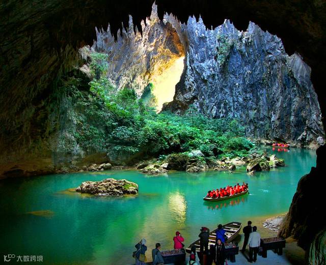 可步行穿天悬空栈道观光,亦可乘船抵达华南至打穿天溶洞。