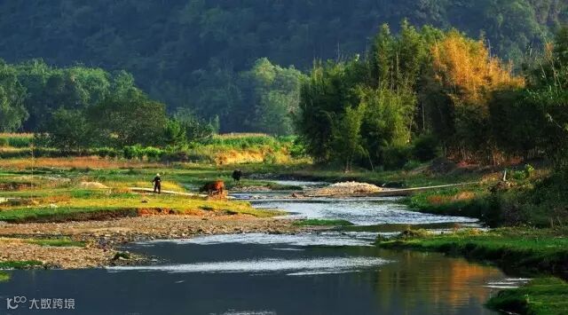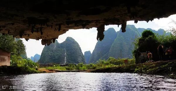 林尽水源,便得一山,山有小口,仿佛若有光.便乘船,从口入,沿暗河,乳石姿态万千,穿洞而出,豁然开朗,土地平旷,屋舍俨然,有酒店美池桑竹之属。