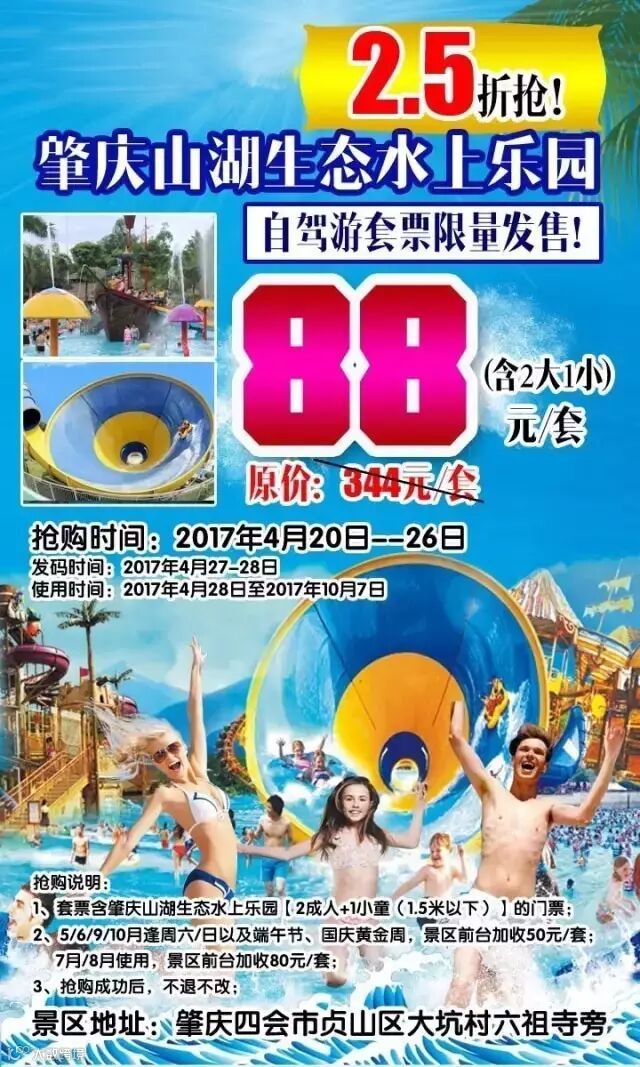 ◆ 套票含肇庆山湖生态水上乐园【2成人+1小童(1.5米以下)】的门票;