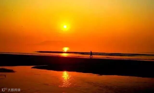夜幕降临,夕阳西下,在夕阳的照射下,海水金灿灿,漫步沙滩,大手牵小手,浪漫至极。