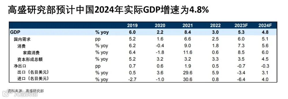 在高盛发布的《2024全球宏观经济展望》报告中,其认为主要经济体将免于经济衰退,2024年全球GDP增速预计为2.6%。而对于中国宏观经济增长的预测,高盛认为在政策支持、投资升温、居民消费支出温和增长的背景下,预计2024年中国实际GDP增速为4.8%,高于国际货币基金组织(IMF)给出的4.6%的预测值。