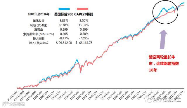 不给力啊!从1881年到2016年,美国标普500的年化收益是8.83%,CAPE20择时少了0.3%,只有8.50%。而在回撤方面,CAPE20择时模型也并没有起到预期效果,只把83.70%的最大回撤减小到了72.90%。