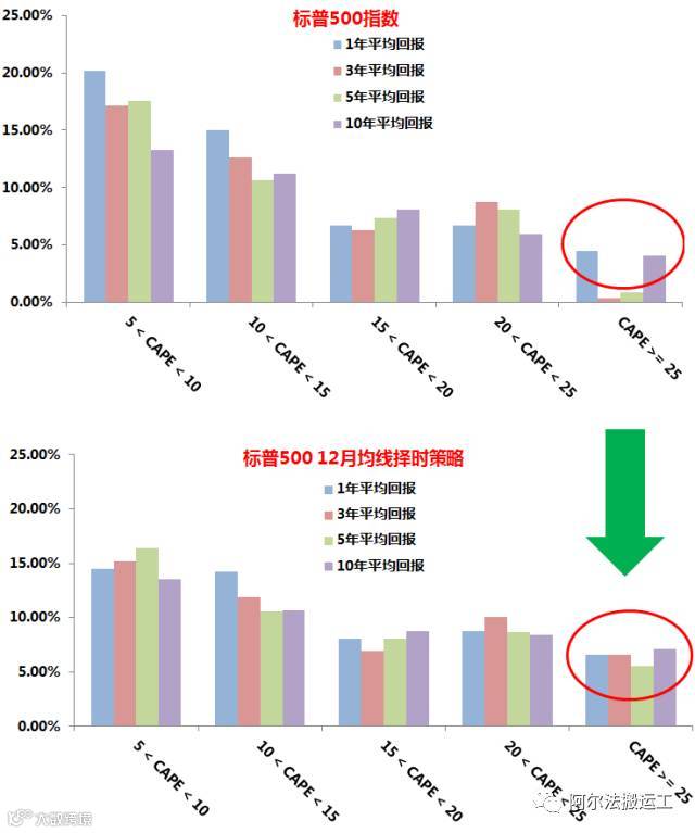 虽然和标普500一样,随着CAPE率的升高,SP500均线策略的未来平均年回报也呈现递减的趋势。但我们发现在CAPE率高于25的时候,SP500均线模型的历史表现要明显优于标普500指数。