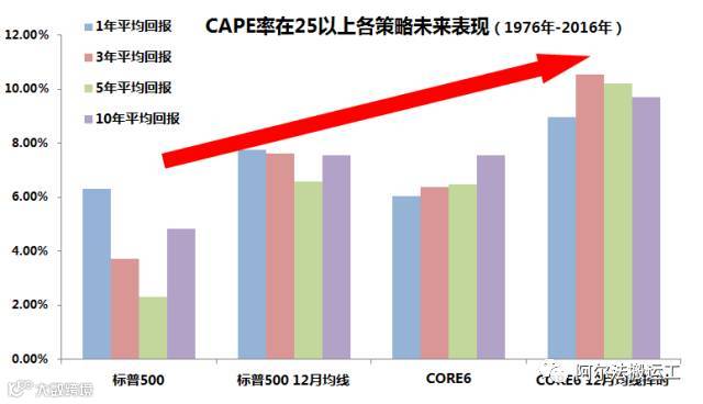 资产配置是永恒的解决方案。投资者可以采用趋势投资择时,以期达到在牛市中少踏空,在熊市中早抽身的效果,加上多元化多市场投资,分散系统性风险。而且历史数据显示,在CAPE比率较高的时候,这两种方式不管是在收益和风险上,都优于单纯的持有美股。