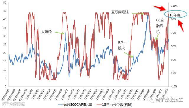相对值来说,通过计算滚动15年期的百分位数,我们得到16年底的CAPE在过去15年的百分位数达到了99.83%!几乎是15年内的最高点。