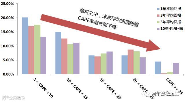 图中的趋势很明显,随着CAPE比率 的升高,标普500接下来的平均年回报骤减,10年平均年回报从13.24%直接降到4.05%。