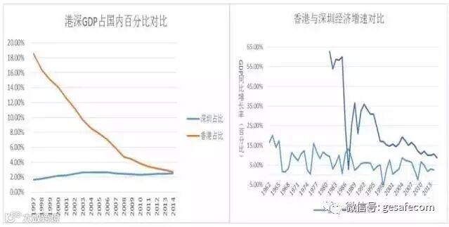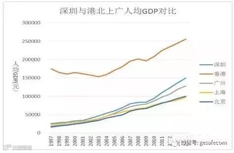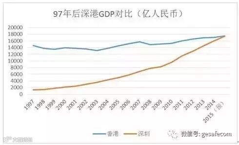 1997年,香港回归,当时的香港作为创造了经济奇迹的“亚洲四小龙”之一,以不及大陆千分之六的人口与约万分之一大陆面积的弹丸之地,创造了相当于大陆近20%的GDP。而与香港仅一条深圳湾之隔的深圳市,在18年前,尽管已经历长达近20年的经济腾飞,但每年创造的GDP却够不上全国的一个零头。