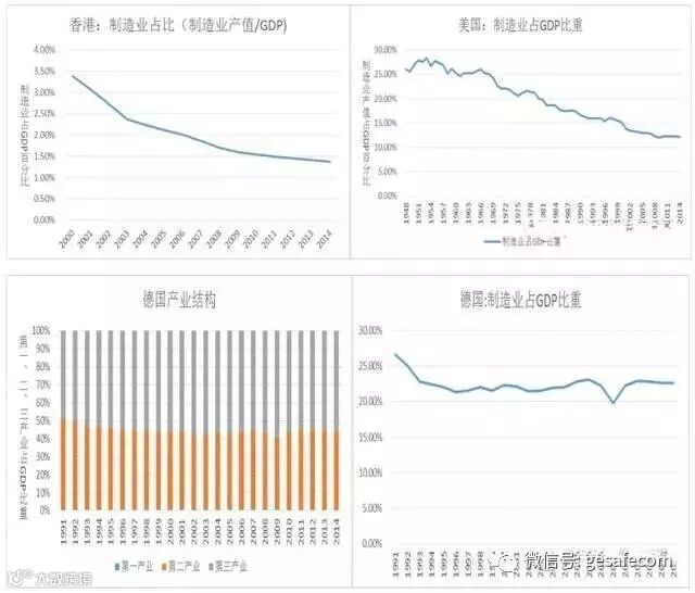 反观香港,制造业的严重空心化,已经让它失去了发展“工业4.0”的先机。2014年底,香港制造业占比居然还没有达到1.5%,比起美国的12.1%和德国的22.6%,差距绝对不是一朝一夕可以赶上的。