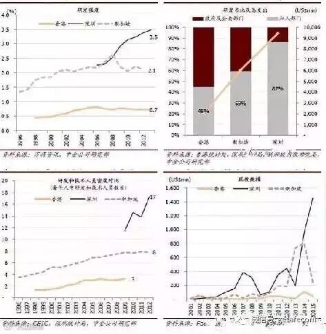 笔者引用中金的四张图表来对比一下香港在科研、创新方面的掉队情况: