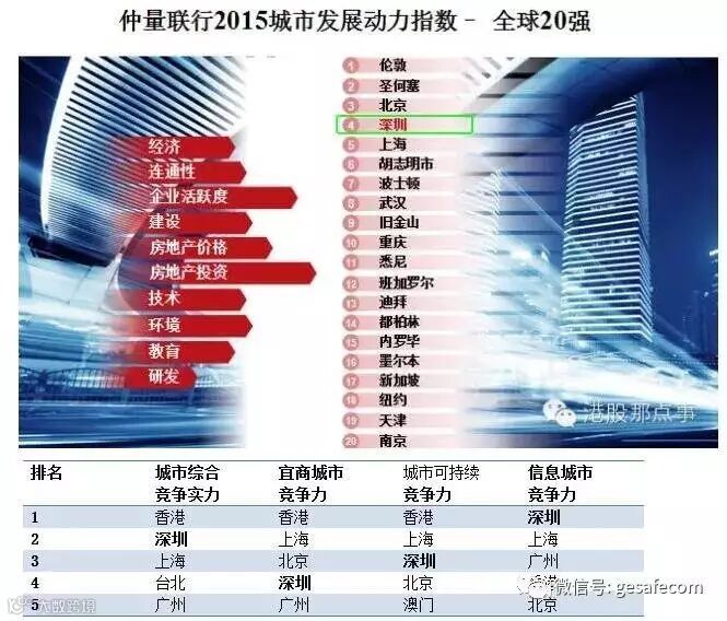 2015年仲量联行发布的城市发展动力指数全球20强中,深圳排名第四,城市发展充满活力,而前二十名中已然找不到香港的踪影。 2014年,中国社科院发布了《城市竞争力报告2014》蓝皮书,深圳脱颖而出,在综合经济竞争力中排名第二,仅次于香港,并在10项主要竞争力指数中名列前茅。深圳正在以惊人的速度崛起,正如其2015年的房价飙升。