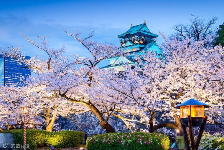 大阪城公园赏夜樱,樱花在霓虹灯的映衬下,在夜色中唯美至极!