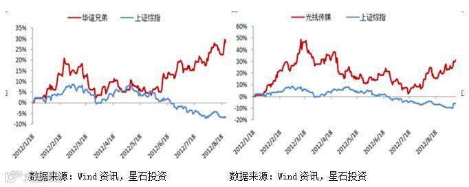 2012到2013年期间传媒行业的行情并不是板块普涨,而是部分龙头公司先后发力。在2012年1月中旬华谊兄弟、光线传媒、乐视网三家公司开始发力半年后,另外两家龙头公司人民网、华策影视开始接力上半年传媒板块的行情。其中华策影视在同期大盘下跌2.48%的情况下,4个月逆势上涨43%。