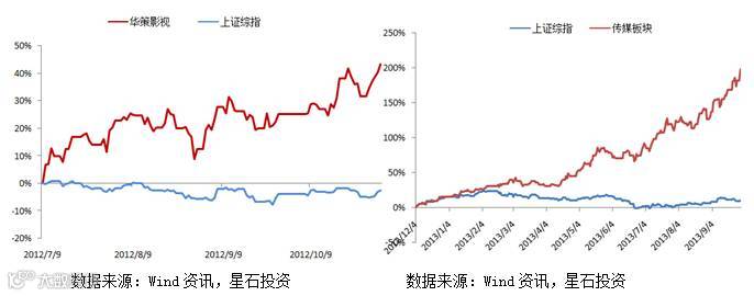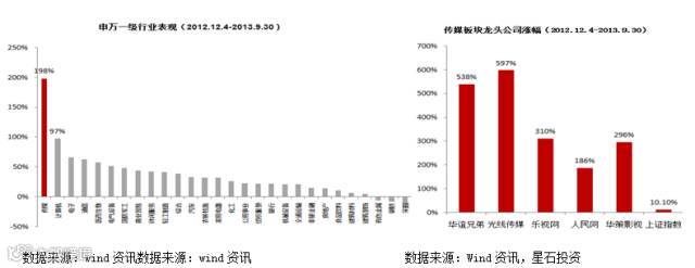 第二阶段:2013年由部分龙头公司行情演变为板块普涨行情:在经历了2012年传媒行业部分龙头的大涨行情后,整个板块开始全面发力。自2012年12月4日至2013年9月30日大约3个季度的时间里,整个传媒板块暴涨198%,而同期的上证指数涨幅只有10.1%,并且这期间传媒板块基本走出一路上涨的行情,没有太大回调。