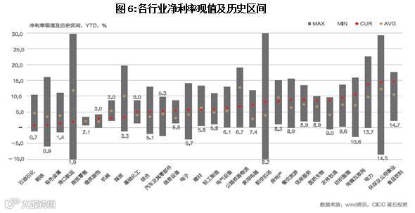 更进一步,通过对行业盈利数据的历史比较发现,目前各行业净利率现值已经普遍高于其历史均值(见图6),说明价值股的投资价值越来越获得盈利数据的支持。我们预计在明年宏观经济整体增长平稳的背景下,公司的盈利增长将会持续修复。