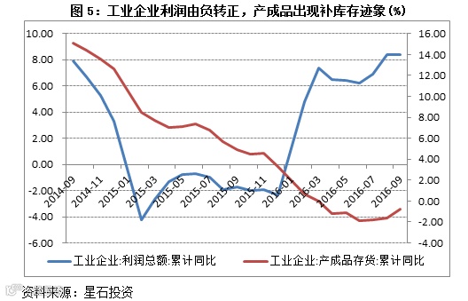 其次从盈利的角度看,企业生产积极性的不断提高带动盈利持续修复:企业的中长期贷款8月份以来出现回暖,企业的补库存周期开启,产成品的库存今年下半年以来也持续上升(见图5),我们判断本轮企业补库存周期有望持续1-2年。企业的盈利也出现回升,工业企业利润总额增速已于2016 年由负转正,在价格回升的带动下10月份单月同比增长9.8%(见图5);A股剔除金融的三季报收入增速从1.7%上升至4.3%,盈利增速从0.8%上升至12.6%。