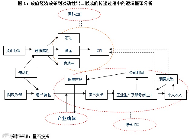 2017年中国和美国为核心的财政政策主导时代,全球经济政策将找到新兴市场基础建设投资(中国和美国)作为载体,则将主要作用于资本支出,资本支出作用于工业生产及服务(就业),从而影响公司利润和个人收入。个人收入影响消费支出,消费支出反作用于工业生产及服务(就业);而公司利润直接影响股票市场,则形成流动性的增长属性出口。政府经济政策到流动性出口形成的传递过程中的总体逻辑框架