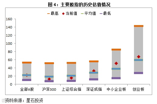 首先从估值的角度来看,A股的估值已经相对合理:我们对比了主要成份指数近15年的估值情况(其中中小板起始于2004年、创业板起始于2009年),全部A股的估值已经回落到了平均值,沪深300、上证综合指数的估值回落到了平均值以下,并且接近了历史底部;尽管成长股的估值仍有一定的高估,但是也基本回落到了平均值附近(见图4)。