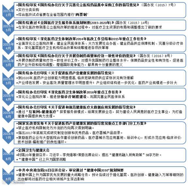 2015年以来,关于医疗改革的政策加速出台并落地(见表3),从力度来看完全可比拟十二五期间政府对文化产业的支持。尤其是在8月19日至20日在北京召开的全国卫生与健康大会,是新世纪以来召开的规格最高的会议,国家高层领导人全部出席,体现出国家对健康产业的高度重视。会议结束不久中共中央政治局8月26日召开会议,中共中央总书记习近平主持会议,审议并通过“健康中国2030”规划纲要。“健康中国”的战略地位再度提升,在国家一系列医改政策的作用下,医药生物板块的发展趋势逐渐明朗,投资机会有望显现。未来医药股能否走出类似文化传媒行业在2012年和2013年的牛市行情,让我们拭目以待。