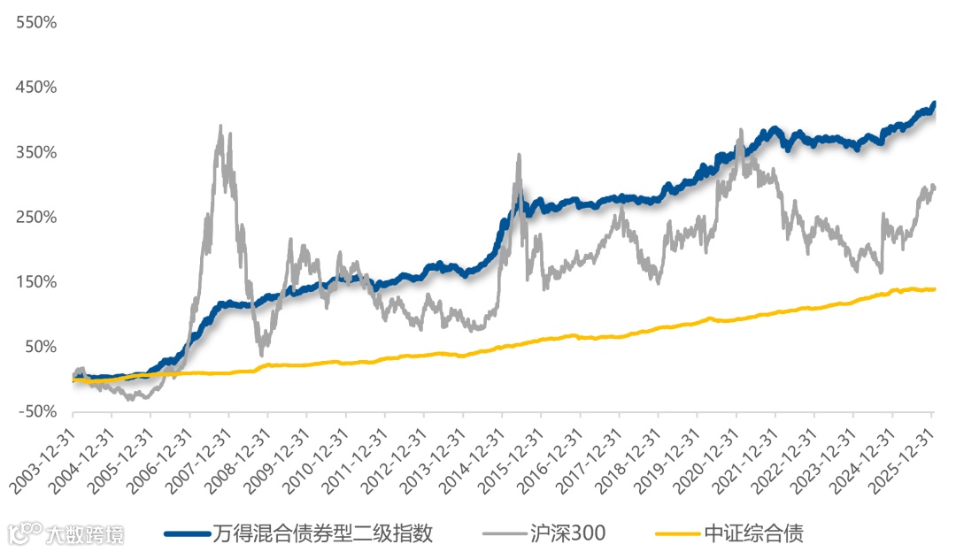数据来源:Wind,统计区间为2003.12.31至2026.1.30。万得混合债券型二级指数覆盖了市场上采用混合债券型策略的基金产品,对于提供二级债基策略的基金表现具有参考意义,不是产品合同约定的业绩比较基准。指数业绩不预示未来表现,不构成对本产品业绩的保证。