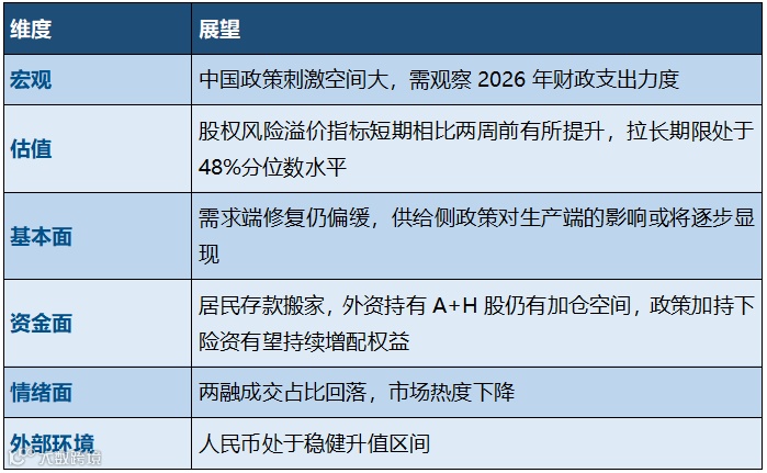 2026 财政政策持续积极。12月27-28日,全国财政工作会议在北京召开,总结 2025年财政工作,布置 2026 年重点任务。会议指出,2025 年财政工作取得新成效,2026年,要继续实施更加积极的财政政策,包括 1)扩大财政支出盘子,确保必要支出力度;2)优化政府债券工具组合,更好发挥债券效益 ;3)提高转移支付资金效能,增强地方自主可用财力;4)持续优化支出结构,强化重点领域保障等,推动经济实现质的有效提升和量的合理增长,为实现“十五五”良好开局提供有力保障。11月工业企业利润公布。2025年12月27日,国家统计局公布数据:11月,规上工企营业收入同比下降0.3%,降幅较上月收窄;工企利润同比增速下降13.4%,降幅较上月扩大7.9个百分点,虽然基数走高,但利润同比两年年均增速继续下行,环比增速高于近 5 年中位数主要是由于 2020-2022年11月环比低,整体指向盈利仍然缺少有效支撑。12月PMI超预期。2025年12月,制造业PMI超预期上升0.9pct至50.1%,较上月升幅扩大0.7pct;非制造业商务活动指数环比回升0.7pct至50.2%,重新站上荣枯线。制造业 PMI 延续明显上升,逆季节性走强,产需延续回暖,生产经营活动预期继续显著改善,或带动企业节前补库。元旦小长假出行活跃。根据交通部数据,2026年元旦假期(2026/1/1-1/3)全社会跨区域人员流动量达5.95亿人次,日均1.98亿人次,日均同比增长19.62%。同比增速较大,或由于2025年元旦假期仅一天,形成较低出行需求基数。