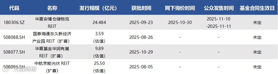 截至11月28日,已获批待上市REITs共有4只(含扩募3只),情况如下表所示: