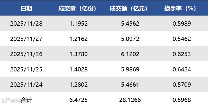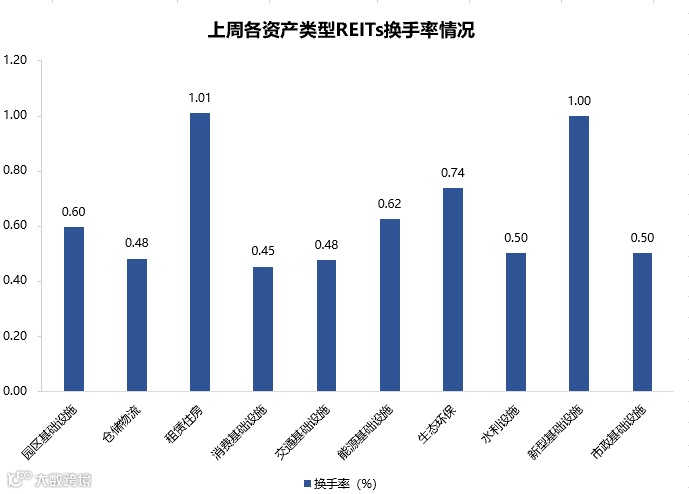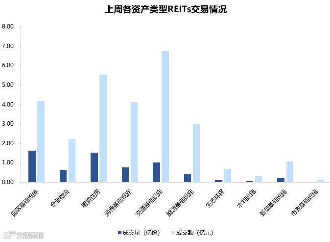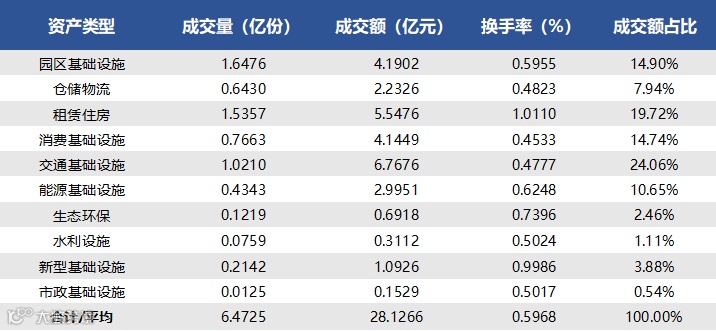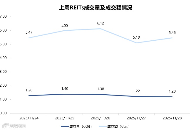 2025年11月24日至2025年11月28日,合计成交量6.4725亿份,成交额28.1266亿元,区间换手率0.5968 %。各资产类型方面,上周园区基础设施REITs成交量最高,共计1.6476亿份;市政基础设施REIT成交量最低,共计0.0125亿份。另外在成交额占REITs总成交额比重中,交通基础设施REITs(24.06%)排名较高,市政基础设施REITs(0.54%)排名较低。