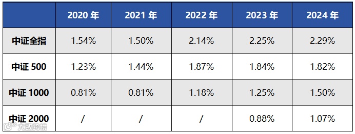 中证全指近三年股息率均保持在2%以上,比中证500、中证1000等指数更“大方”