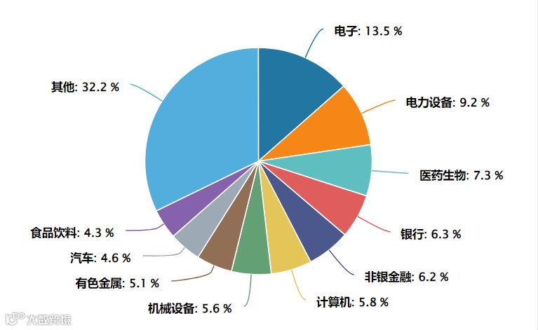 中证全指成分股覆盖全部申万一级行业,既包含传统行业龙头,也涵盖新兴成长企业。其中,前十大行业主要集中在电子、电力设备、医药生物、非银金融、银行等行业,同时,其前十大行业权重占68%左右,分布相对均衡。