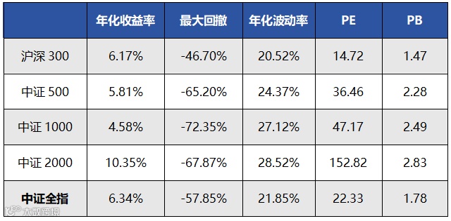 从历史收益表现来看,自2014年以来,中证全指的年化收益率仅次于中证2000指数,处于各宽基指数中位数附近,同时年化波动率和最大回撤控制相对较优。另外,当前指数估值水平(PE、PB)较低,具备较好的安全边际,为增强策略的持续优化提供了有利环境。