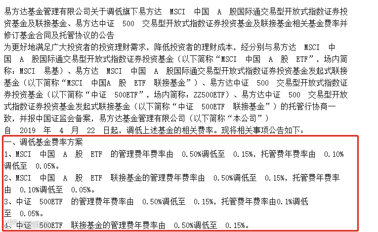 2019年4月20日,易方达基金正式公告,将旗下跟踪中证500和MSCI中国A股的ETF指数基金和联接基金管理费率大幅下调70%,下调后管理费率同样只有0.15%,指数基金价格费率战就此打响。