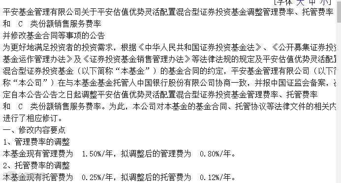 平安基金更是将主动权益产品的管理费拉到了1%以下。目前市场上主动权益基金的管理费一般是1.5%每年。平安基金5月8日公告,调整旗下平安估值优势混合基金的管理费和托管费。现有管理费为1.50%/年,拟调整后的管理费为0.80%/年。现有托管费为0.25%/年,拟调整后的托管费为0.12%/年。