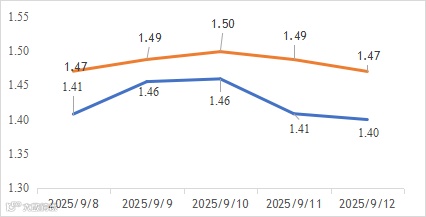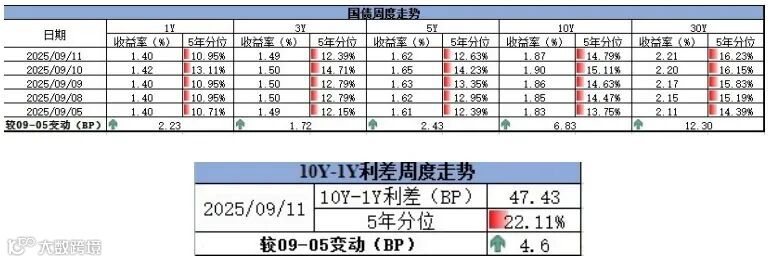 截至9月11日,国债收益率短端长端皆上行,曲线走抖,10Y-1Y利差为47.43,较9月5日走扩4.60BP,处于近5年22.11%的历史分位。