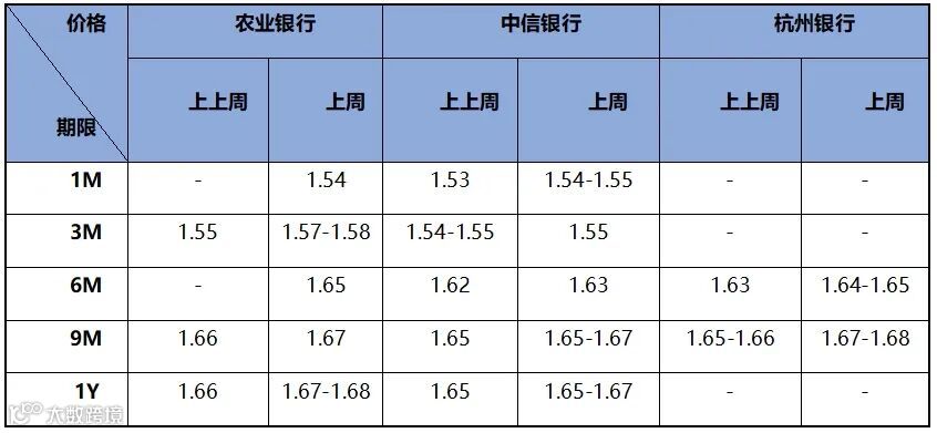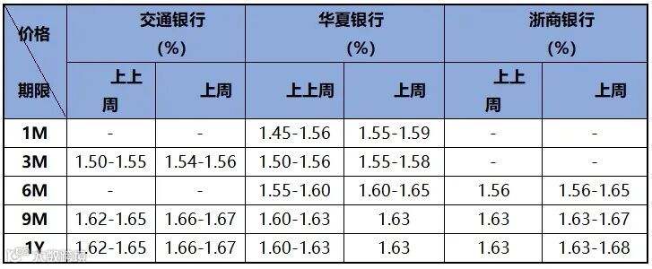 存款价格方面,因资金边际收紧,存款价格小幅提升。近两周存款市场情况如下表所示: