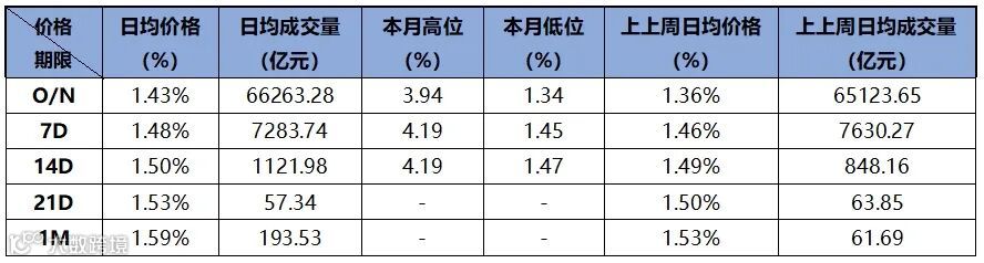 上周资金市场较上上周边际收紧,但整体依旧较为宽松,周一至周三利率隔夜成交在1.5%附近,信用隔夜成交在1.52%。周四及周五资金逐步宽松,周五隔夜加权降至1.4%,银行供给非常充裕,信用隔夜价格也降至1.43%附近,7d押利率报在1.45%,押信用报在1.48%。
