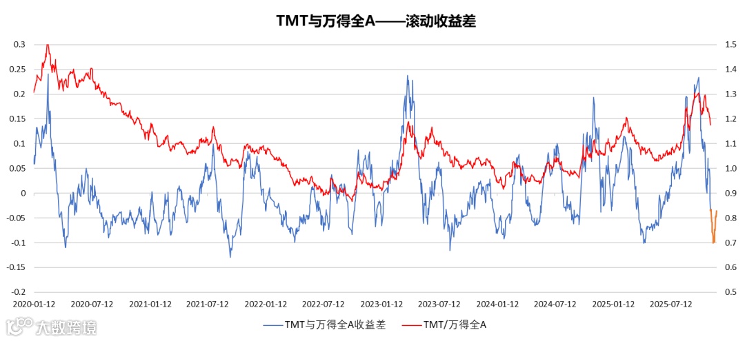 同时,TMT板块较WIND全A的超额收益快速收敛,通过近2月滚动收益差拟合测算,后续TMT连续跑输市场的概率已显著降低,短期调整压力正逐步释放。