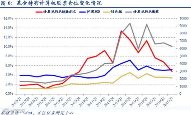 基金持有计算机仓位持续下降。2016年Q3基金持有计算机公司占总持仓比重为4.8%,连续三个季度下降(2015Q4、2016年Q1、2016年Q2分别为11.3%、7.72%、6.76%),已经下降至2013年Q4(4.76%)附近水平。