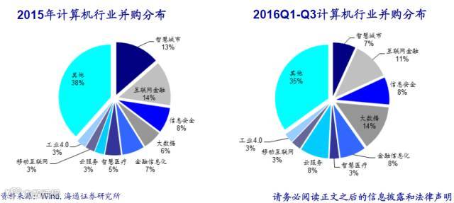 海通证券计算机行业郑宏达(首席分析师,新财富第五名)团队认为:并购业绩承诺完成率高:15年的并购高峰将支撑17年业绩增长,16年以来,云服务、大数据、金融信息化领域并购增多,看好龙头企业崛起。