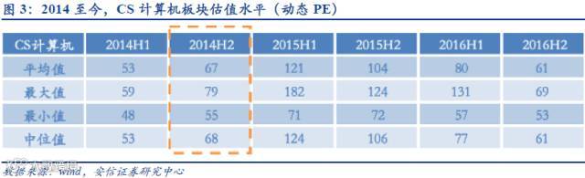安信证券计算机行业胡又文(首席分析师,新财富第一名)团队认为当前计算机板块PE 与2014 年H2 接近。通过对计算机板块2014 年至今以半年为间隔的估值水平(动态PE)做了比较分析。可以看出,当前(2016.11.30)中信计算机动态PE 约为54 倍,接近2014H2 期间水平。考虑到计算机板块正处产业拐点,技术、政策、应用各类催化不断,计算机行业目前具备一定的安全边际。