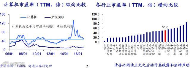 此外计算机行业市盈率(TTM)51.6倍,接近自2006年以来的历史平均市盈率48倍和中位数46倍。