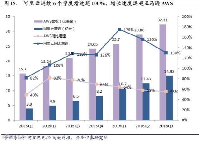 从阿里云、亚马逊AWS的2015Q1-2016Q2强势表现来看,全球云计算整体的产业还尚处于快速增长期。从整体增速上来看,阿里云已经连续六个季度,同比增速超100%,整体的增长速度远超亚马逊AWS。虽然从整体体量上看,阿里云还远逊于亚马逊AWS,但更快的增速以及考虑到中美IT成熟度的差异,都一定程度上说明了国内云计算产业的巨大潜力,正在逐步步入快速爆发期。同时,我们看到腾讯的2016年三季报显示,腾讯支付相关服务和云服务增长同比增长348%,云服务收入同样呈现爆发式增长势头。