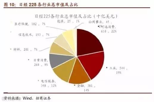 根据上文我们的对蓝筹拓展含义的阐述,日经225可以作为典型的中间蓝筹样本,从日经225目前各行业市值占比来看,可选消费行业以22%的市值占比排在第一位,与SP500差异显著。并且从蓝筹股市值来看,是显著小于SP500可比公司的。