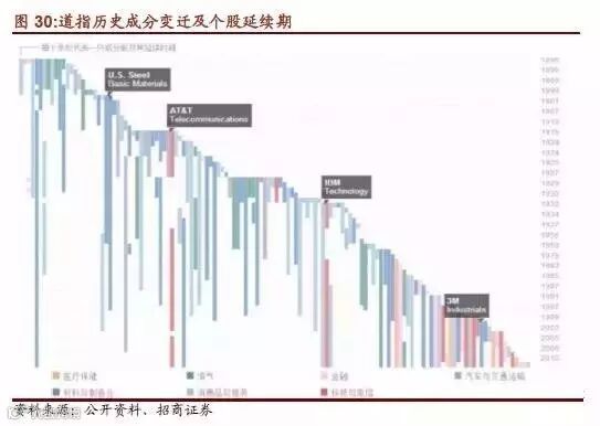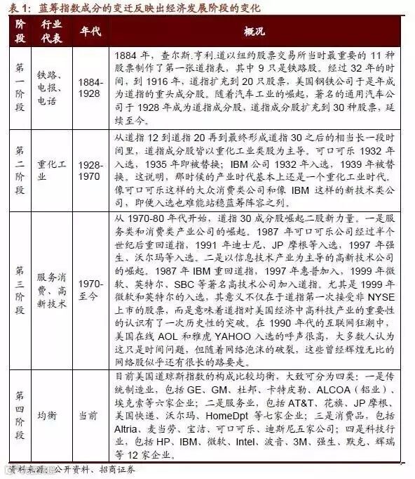 从道指30的百年演变中我们看到,华尔街的蓝筹股阵营在大的趋势上经历了从铁路公司到重化工业公司再向服务类的第三产业和新技术产业公司的过渡。